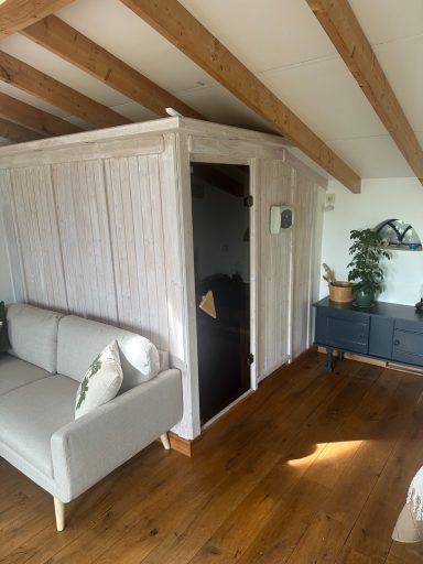 Het huisje is van alle gemakken voorzien: een tweepersoonsbed, een zithoek, keukentje, toilet, douche en zelfs een sauna om te ontspannen na een lange dag.